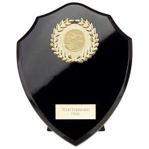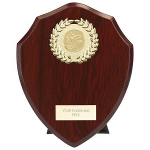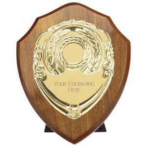 ROSEWOOD SHIELD AND GOLD TRIM TROPHY